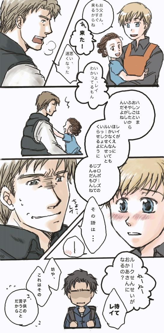 ◆レイアと離婚して男手ひとつでベンを育ててたら成り行きでレイちゃんまでひきとることになったハンソロお父さんは保育園でたまたまベンちゃんとレイちゃんの担任になったルーク先生に惚れちゃうよ。ベンちゃんはルーク先生大好きだけど万年反抗期だから先生にモーションかけてるおとんにイライラしてるといいと思います。レイちゃんは無邪気に「ルークせんせーもおうちにいればいいのに」って思ってて、ベン兄が複雑な顔してるのは理解に苦しむし邪魔するつもりならしばくと心に決めています(バイオレンス)