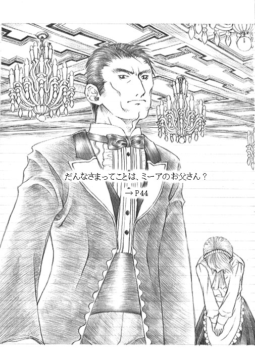 ミーアとは挿絵の2で出てきた少年の名前です。 上のおじさんはその父親ですね。 一応顔とか似せようとしたんですが、実力不足のあおりポーズでデッサン崩れて、 結局なごりは目元くらいに。 目つき悪いですか? いやはや…(汗)