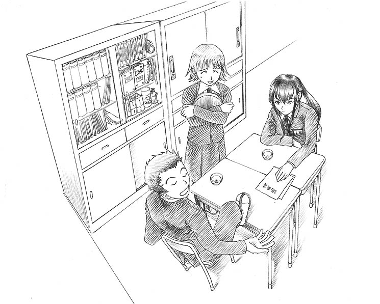 はなさんの小説 「セイカな一日」 の挿絵に描かせていただいたイラストです。 パソ画像用にしては珍しくエンピツ画です。 苦労して描いたわりにはパースが狂っているように見えます……というか狂ってます(汗)