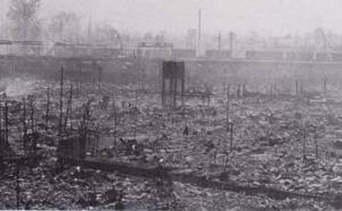 J R 山手線、大塚駅北口の焼け跡で、左端の ビルが白木屋 デパート( 現 大塚 ビル )です。火に囲まれ デパートの地下に逃げ込んだ人達が大勢焼死しました。![]()
